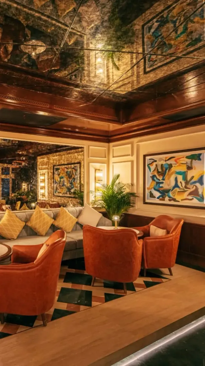 Дизайн интерьера ресторана выполнен в элегантном стиле. Потолки украшены зеркальными панелями, отражающими мягкий свет и добавляющими пространству глубину. Стены декорированы панелями и современными картинами в ярких оттенках. Барная зона выполнена из темно-зеленого мрамора с металлическими акцентами. По залам расставлены живые растения и деревья.