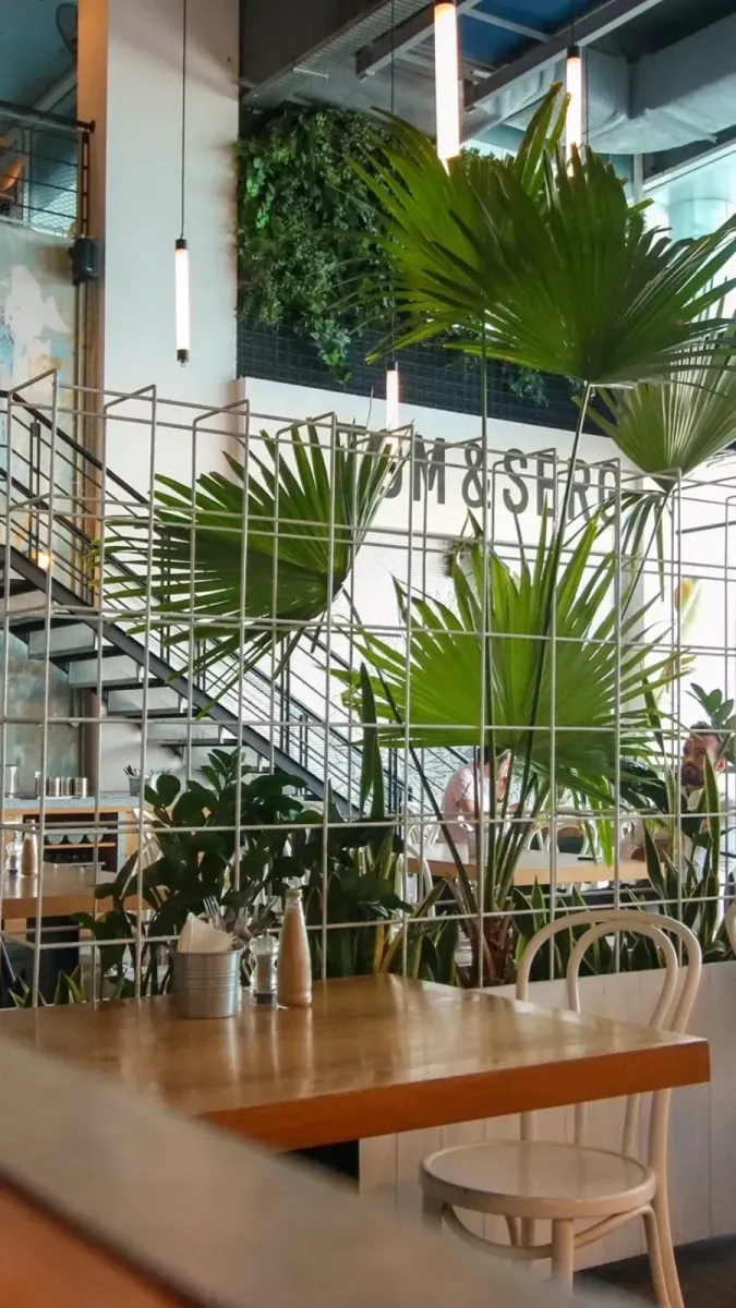 Дизайн интерьера выполнен в стиле лофт с элементами скандинавского минимализма. Внутри — просторное помещение с высокими потолками, стены с грубой текстурой и эффектом состаренной штукатурки и лаконичные деревянные столики с белыми стульями. По залу расставлены горшки с живыми растениями. Панорамные окна наполняют пространство естественным светом и открывают виды на город.