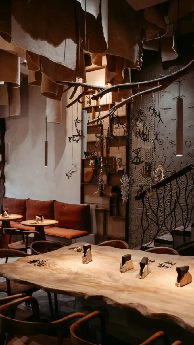 Интерьер выполнен из натуральных материалов с отсылками к древним жилищам. Стены покрыты красной и голубой глиной с неровной фактурой. Их украшают рисунки в стиле наскальной живописи с абстрактными фигурами, символами и сценами из жизни древних народов. Мебель массивная, из необработанного дерева и камня. Столы и скамьи выполнены в грубой, монолитной форме, стулья имеют простые, но удобные конструкции. В центре зала расположена открытая кухня с очагом и русской печью, где готовят блюда на живом огне.