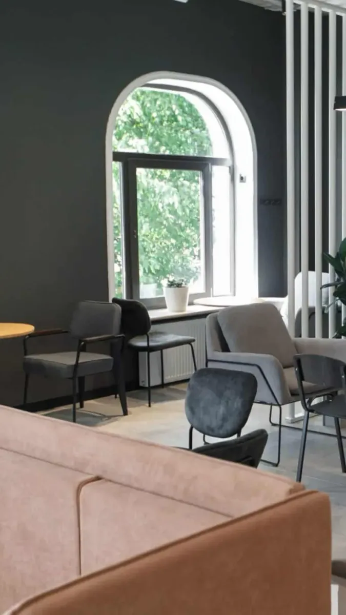 Интерьер кафе выполнен в современном минималистичном стиле с акцентом на светлые оттенки, дерево и индустриальные элементы. Барная стойка оформлена в теплых древесных тонах, сочетающихся с белой кафельной плиткой. Внутри — уютные мягкие диваны, удобные стулья с небольшими столиками и длинный деревянный стол в центре зала. Большие панорамные окна, с арочными проемами, наполняют пространство естественным светом.