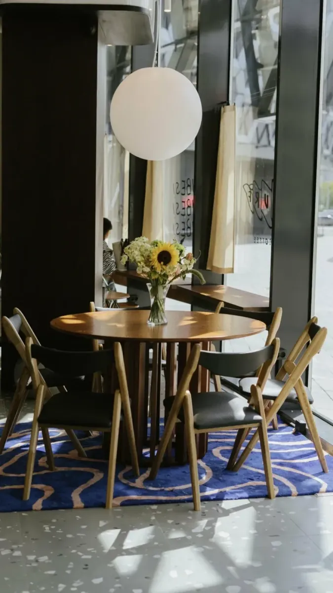 Дизайн интерьера выполнен в духе африканской саванны с элементами уличного искусства. На стенах — граффити с изображениями тигра, гор, солнца и волн, создавая ощущение путешествия и приключения. Удобные кресла и уютные столики у окон делают это место идеальным как для дружеских встреч, так и для уединённого отдыха с чашкой кофе.