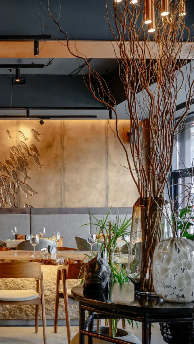 В оформлении преобладают дерево, камень и мрамор, создавая атмосферу уюта и естественной гармонии. В центре зала — длинный деревянный стол. Открытая кухня позволяет наблюдать за процессом приготовления блюд, добавляя динамики и вовлекая гостей в гастрономическое путешествие. Освещение в ресторане приглушенное, с акцентными светильниками, подчеркивающими фактуру материалов. Декоративные панели с восточными мотивами, керамические вазы и аккуратные японские элементы, дополняют атмосферу и делают пространство стильным, но ненавязчивым. Заведение дополняют живые растения и высокие вазы с сухими ветвями, подчеркивающие естественную концепцию дизайна. У панорамных окон расположены мягкие диваны, откуда открывается вид на город