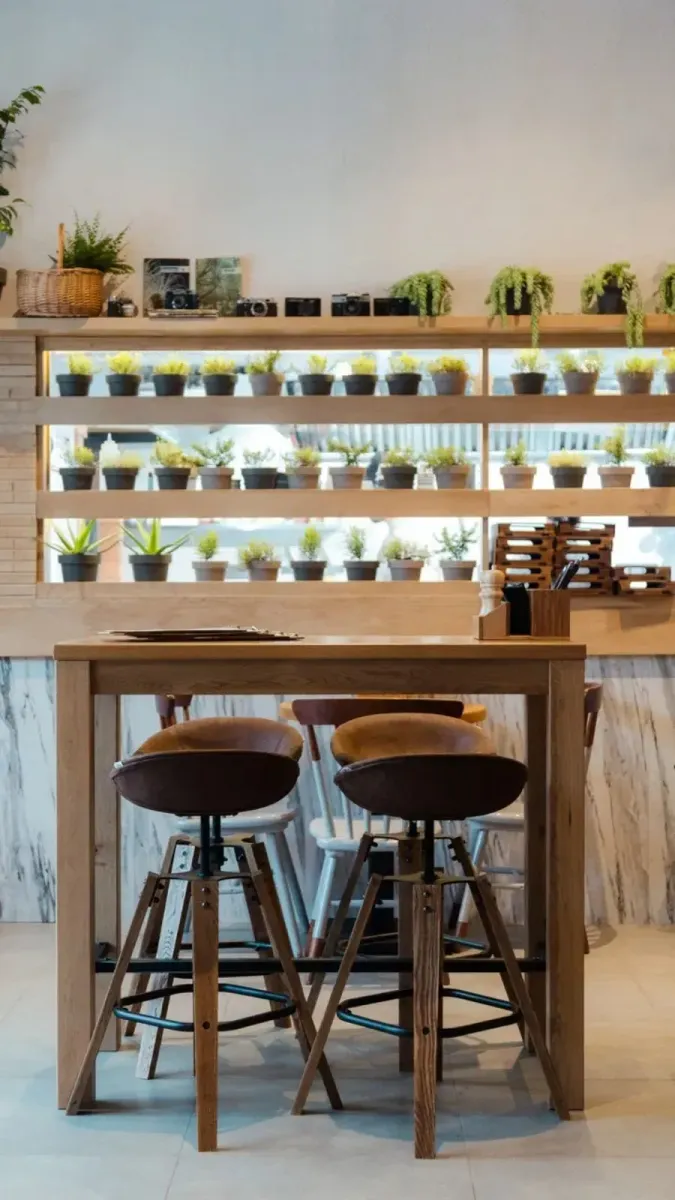 Кафе занимает два этажа, оформленных в скандинавском стиле с элементами эко-дизайна. Интерьер насыщен натуральным деревом и живыми растениями. Из панорамных окон, наполняющих пространство естественным светом, открывается живописный вид на Кавказские горы.