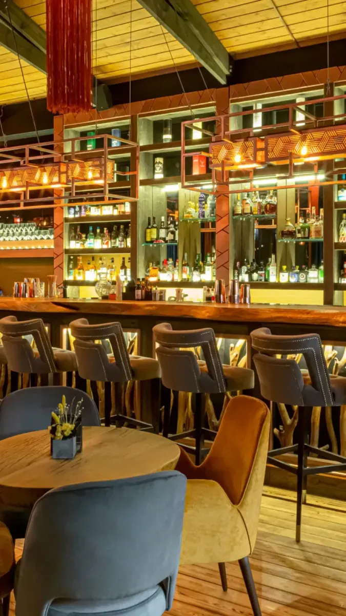 Дизайн интерьера выполнен в современном стиле с элементами эко-дизайна. Внутри — барная стойка из натурального дерева с выразительной текстурой и декоративными элементами в виде ветвей, подсвеченных мягким теплым светом, стулья с высокой спинкой и мягкой обивкой серого цвета, украшенные металлическими заклепками, подвесные светильники с геометрическим дизайном создают акцент на барной зоне.