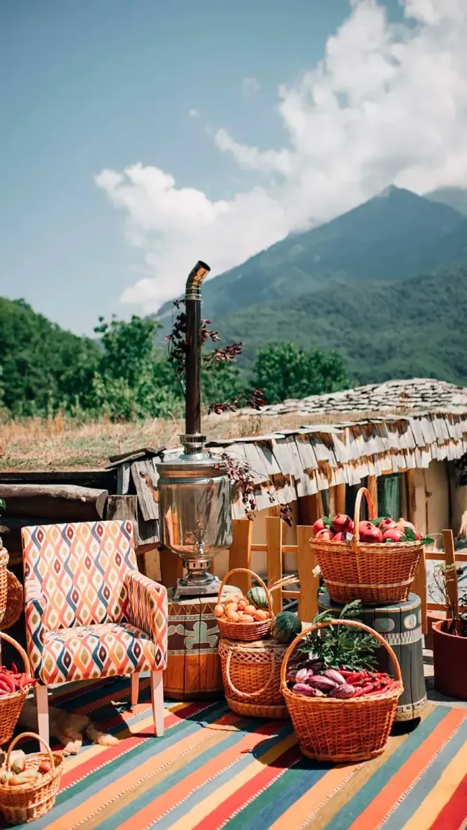 В интерьере — стилистика деревенских домов: глиняные стены без острых углов, расписные фрески ручной работы, камин.