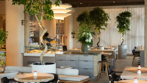 Новый ресторан оформлен в узнаваемом стиле бренда, но с новыми акцентами. Интерьер построен на сочетании натуральных материалов — дерева, травертина, льна и гладкой стали. Все детали — от фактуры столешниц до текстиля — подбирались с учётом общего ощущения уюта и спокойствия. В тёплом освещении, геометричных линиях и плавных изгибах чувствуется идея отдыха и неспешности. Это пространство, где можно задержаться надолго, а не просто зайти на чашку кофе.