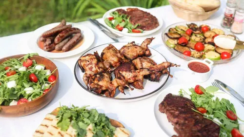 Среди самых популярных позиций — шашлык из свиной шейки «По-Царски» в классическом маринаде с луком и стейк «Наршараб гриль» с гранатовым соком, гвоздикой и апельсиновой цедрой. Есть и куриные ножки в соусе песто, и филе индейки с розмарином, чесноком и перцем. Колбаски представлены в нескольких вариантах: с кавказскими пряностями, мраморной говядиной и даже с лесными грибами в белом соусе. Для тех, кто перепробовал всё, подойдут шашлык из перепелов в томатно-черносливом маринаде и куриные крылышки с индийскими специями.