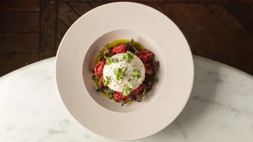 Тунец в одном из новых блюд подается сырым, в виде тартара, и заправляется не стандартными каперсами или луком, а сельдереем и свежим горошком. Дополнительный вкус создают кунжутный соус и гель из лимона с имбирем, он дает тонкий аромат и легкую пряность. Рядом — фермерская буррата, к ней добавляют клубнику, которую предварительно маринуют в лимонной эмульсии. Кисло-сладкий баланс поддерживают вяленые томаты и красный базилик.