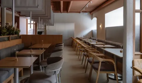 Интерьер бистро объединил японский минимализм и индустриальную эстетику квартала «Красная Роза». Дизайнеры сохранили кирпичную кладку, дополнив её тёплым терракотовым цветом, который подчёркивает уют и исторический стиль здания. Пространство зонировано деревянными перегородками с рифлёным стеклом и подвесными тканями, создающими лёгкость и воздушность. Дизайн выдержан в стиле джапанди, который сочетает японскую сдержанность и скандинавский комфорт.
