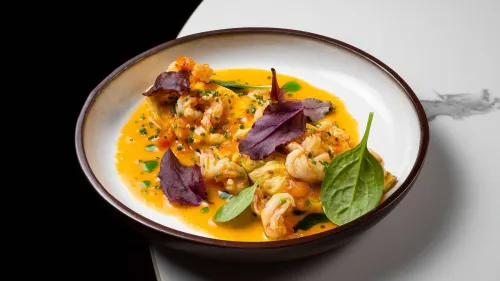 Есть и омлет — он готовится на молоке и сливочном масле, выходит воздушным. К нему идут маринованные томаты и лангустины, обжаренные и слегка пропитанные ароматным биском. Это сочетание делает блюдо чуть более праздничным, не выходя за пределы дневного формата. Не обошлось и без ростбифа. Его предварительно маринуют в горчице и мёде, а подают с картофельным муссом с дымком, стружкой пармезана и соусом чимичурри со свежими травами.