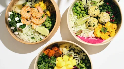Боулы теперь доступны с любым источником белка. Можно выбрать вариант с курицей и большим количеством овощей, с лососем и свекольным хумусом, с фалафелем и гранатом или с тофу и манго. Основа боула тоже подбирается по вкусу: смесь черного и белого риса, орзо или киноа.