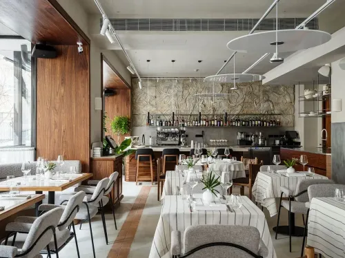 Вместо сувенирной бело-голубой гаммы прибрежных таверн – современный ресторан, похожий на модную средиземноморскую виллу. Вместо стереотипных венков и битья тарелок – стильная кастомная мебель и уверенно вписанные в интерьер артизональные витражи и барельефы. Греческая не только по стилю, но и по духу «Афина» неслучайно носит свое имя: в честь богини как символа сохранения традиций и в честь столицы как эпицентра нынешней жизни страны.