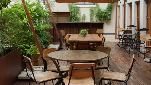 В ресторане «Радио», расположенном в Басманном районе в креативном пространстве «Суперметалл», подготовили летнюю веранду для приятных встреч и теплых вечеров на открытом воздухе. Она оформлена в стиле оазиса с обилием зелени, деревянной мебелью и винтажными креслами-качалками. На площадке стоит удобная мебель, среди которой есть большие столы для семейных посиделок, а зонтики создают тень и защищают от дождя, что позволяет гостям наслаждаться трапезой вне стен заведения.