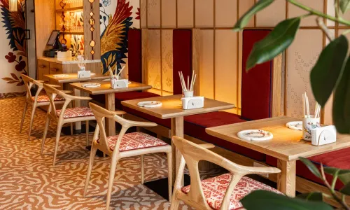 Визуально кафе балансирует между японским минимализмом и русским фольклорным теплом. Интерьер и посуда создают впечатление ручной работы и тактильности — дизайнеры стремились сделать пространство, которое ощущается уютным и неформальным, без нарочитой «японскости», но с уважением к эстетике. Приготовление здесь воспринимается как ремесло и медитативный процесс, где каждая деталь — от нарезки до подачи — работает на общее впечатление спокойствия и внимания.