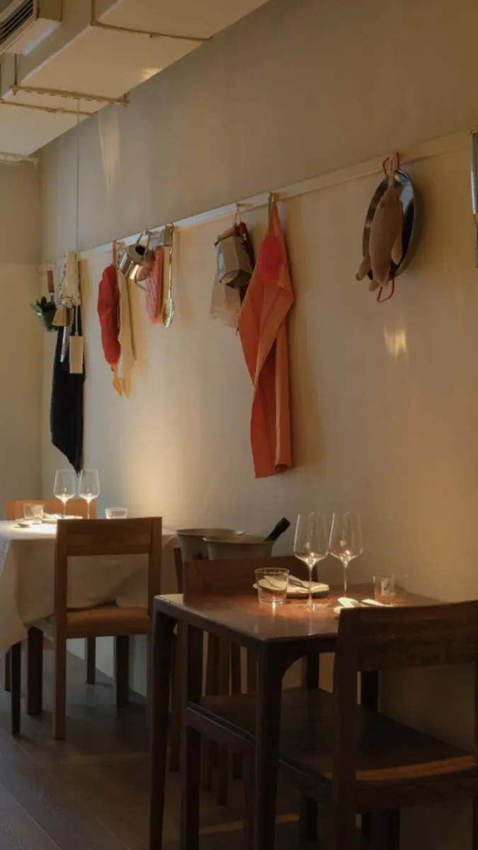 Десертная часть заслуживает отдельного визита: павлова с кукурузным кремом и малиной, мадлен с кофейной карамелью — позиции, ради которых стоит оставить место. Из закусок стоит попробовать пампушки с маслом и яйца с кантабрийским анчоусом. Винная карта собрана под формат неторопливого вечера — без избыточной глубины, но с точным попаданием в настроение.