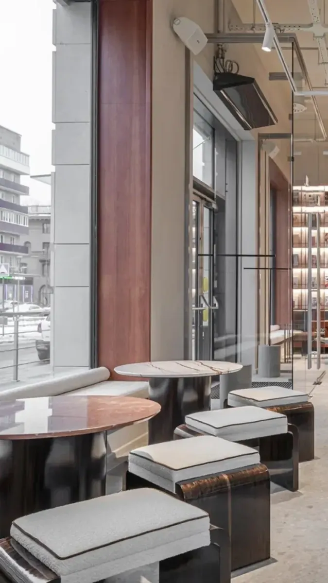 Интерьер кофейни выполнен в современном минималистичном стиле с преобладанием светлых оттенков. Цветовая гамма сочетает в себе белые, бежевые и серые тона с акцентами на натуральное дерево. В центре зала — массивный стол с округлым основанием, окруженный удобными стульями с мягкой обивкой и табуретами с деревянными ножками. Барная стойка выполнена из глянцевой плитки теплого бежевого оттенка.
