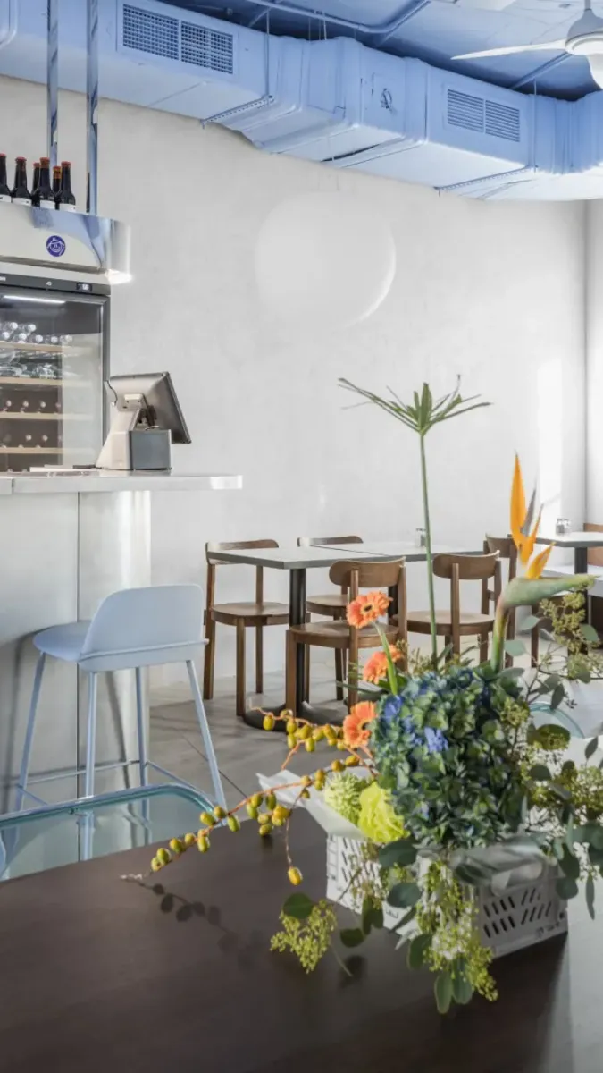 Дизайн интерьера выполнен в минималистичном стиле, с преобладанием теплых и спокойных оттенков. Вдоль стен расположены маленькие столики с деревянными стульями. Барная стойка выполнена из металлических материалов, с высокими светло-голубыми барными стульями, перекликающимися с цветом потолка.
