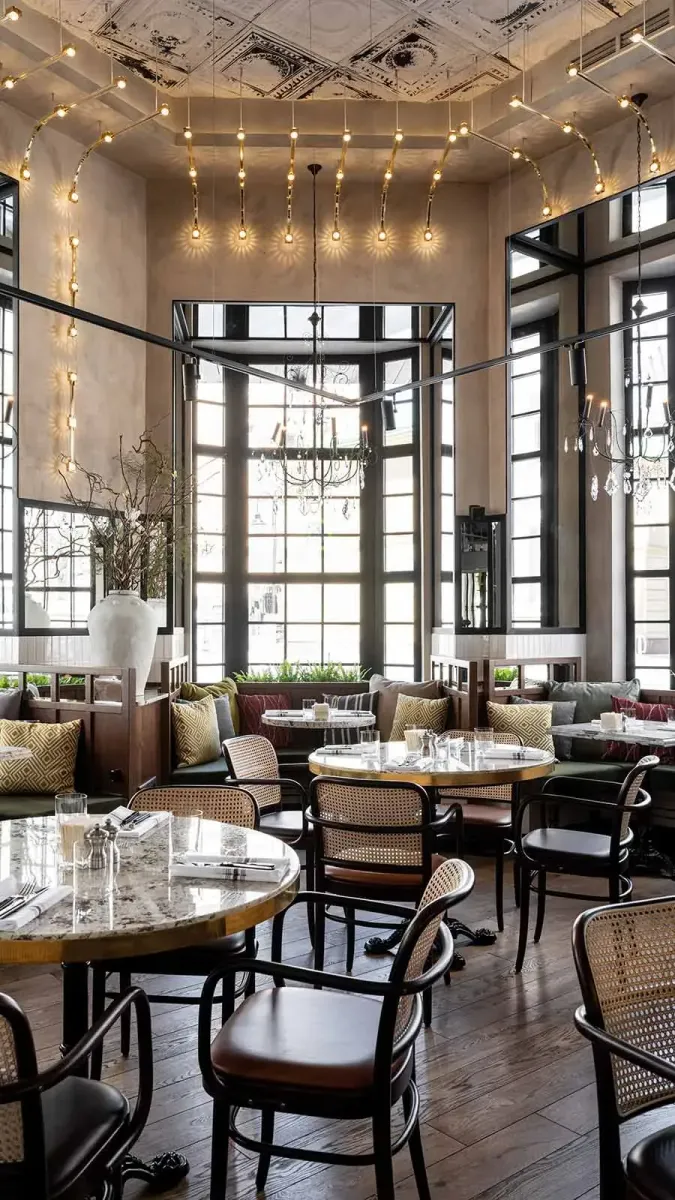 Здесь большой выбор завтраков, такой же внушительный – основных блюд и винная карта – на 30 страниц. Архитектурное решение для пространства предложено студией Натальи Белоноговой: интерьер дорогой и изящный, как винтажные коллекции Коко Шанель.