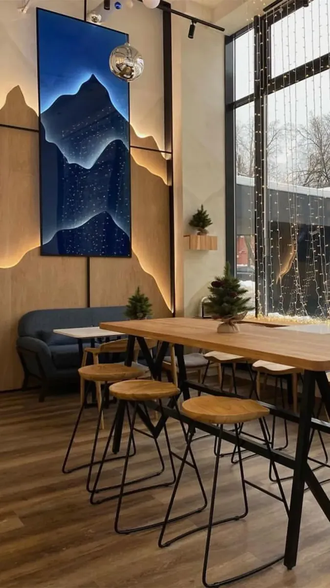 Кофейня MonteView находится в Таганском районе, но внутри кажется, что вы вовсе не в Москве, а где-то в горах, ощущаете свежий воздух и силу природы. Такого эффекта команда добилась за счет скандинавского стиля в интерьере: строгие линии, простота, преобладание бежевого цвета и единственный акцент на глубоком синем, символизирующем чистое небо и горные источники. Панорамные окна добавляют света и романтики — интересно наблюдать, куда спешат городские жители.