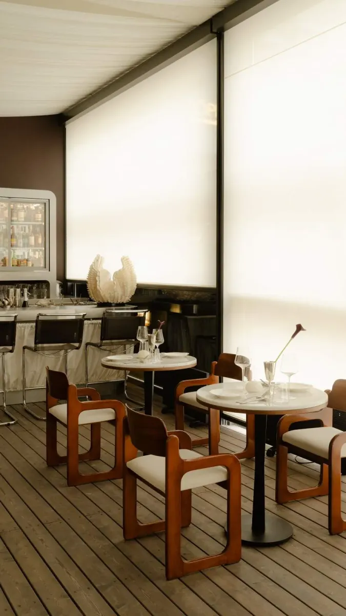 Столярный переулок назван так благодаря мастерским торгового дома «Мюр и Мерилиз», который на рубеже XIX–XX веков был эталоном качества и точности. Владельцы ресторана взяли этот принцип ремесленного перфекционизма за основу кулинарной философии. Дизайнер Валерия Сергеева облекла идею в материальную форму: под потолком — ткань, напоминающая паруса, на полу — палубная доска, а в гардеробе каждому гостю вручают ракушку ручной работы от ювелира Alexander Karpinsky. Мебель Сергеева собирала по блошиным рынкам трёх стран — антикварные деревянные стулья из Испании чередуются с металлическими конструкциями, и этот контраст задаёт визуальный ритм всего зала.