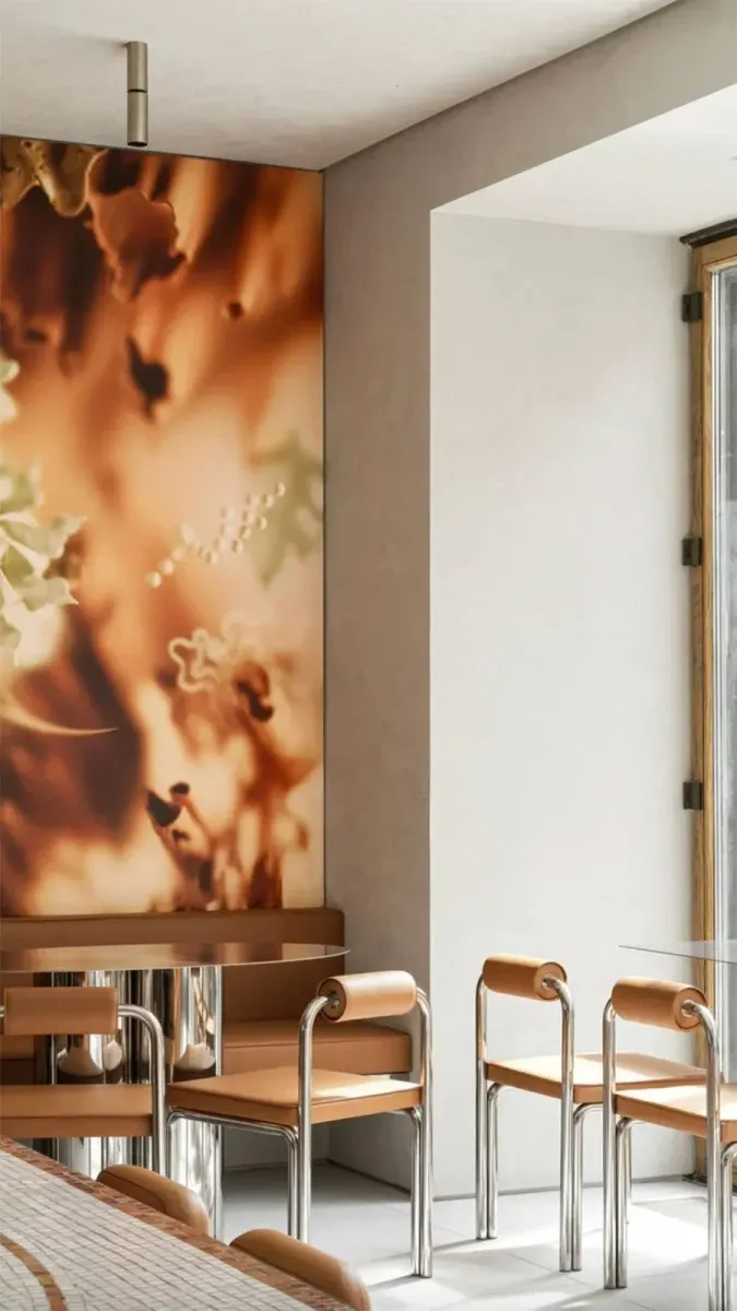 Над интерьером как петербургского, так и московского Nothing Fancy работало бюро Edxxkat Эдуарда Еремчука и Кати Пятицкой. Пространство выглядит футуристично: отражающие поверхности, панорамные окна, серые стены, необычные кожаные стулья от бренда Alien, на стене — яркое панно от Facultative Works. Расположиться можно за отдельными столами или большим коммунальным. Места заранее не бронируют, но благодаря грамотной организации, с посадкой проблем не возникает. Сделать заказ можно у стойки, позади которой находятся светящиеся экраны с меню.