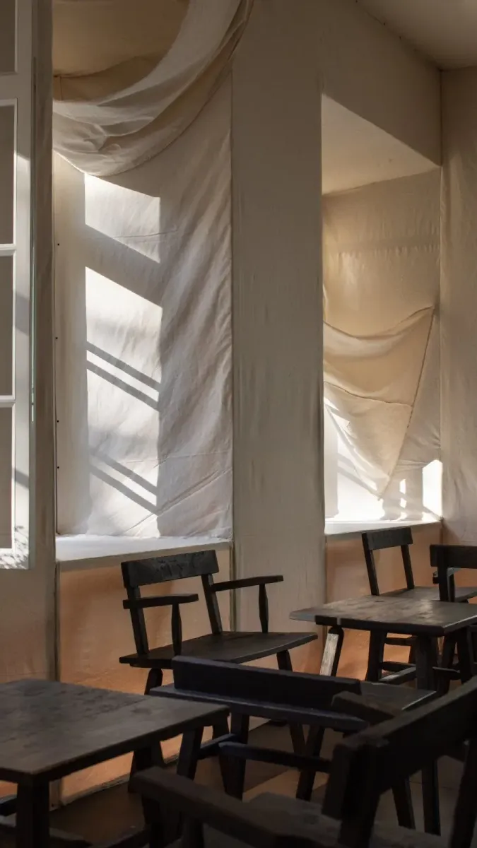 Дизайн интерьера выполнен в стилистике театральных декораций. Внутри — стены, обтянутые белой хлопковой тканью, и минималистичный декор без лишних деталей. Небольшое пространство, по краям обставленное маленькими деревянными столиками и стульями, в центре — большая деревянная стойка.