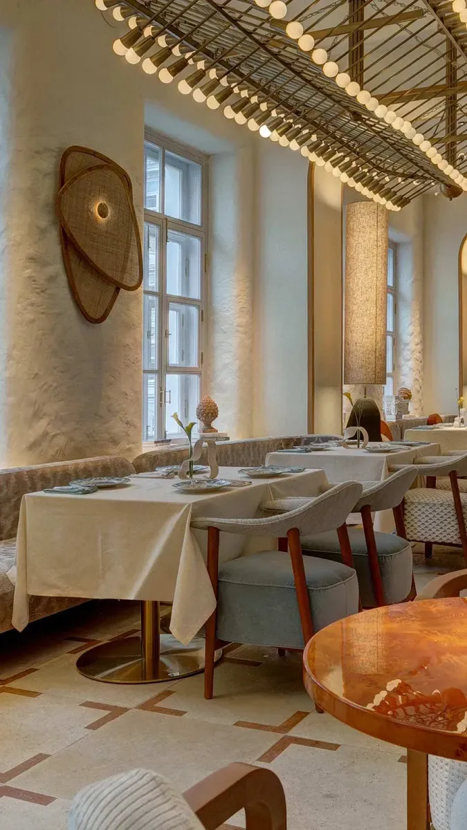 Ресторан занимает два этажа, в интерьере — теплая атмосфера курортов Греции: натуральные природные материалы и оттенки в отделке, узорчатая плитка и элементы декора вроде скульптур. Этажи разделяют ресторан на разные зоны, на первом — барная стойка и брассери в светлых тонах.