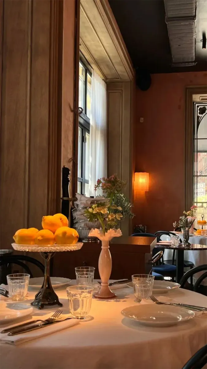 Пространство на два этажа спроектировала петербургская студия Neymand. Стены покрыты авторскими фресками, с потолка свисают хрустальные люстры, а на льняных салфетках вышиты итальянские фразы — деталь, которая задаёт тон всему вечеру. Первый этаж делится на обеденный зал и барную зону с латунной стойкой, второй целиком отдан под большой зал для компаний. Летом к этому добавляется веранда — распахнутые окна в пол, белые занавески и один из лучших видов на район.