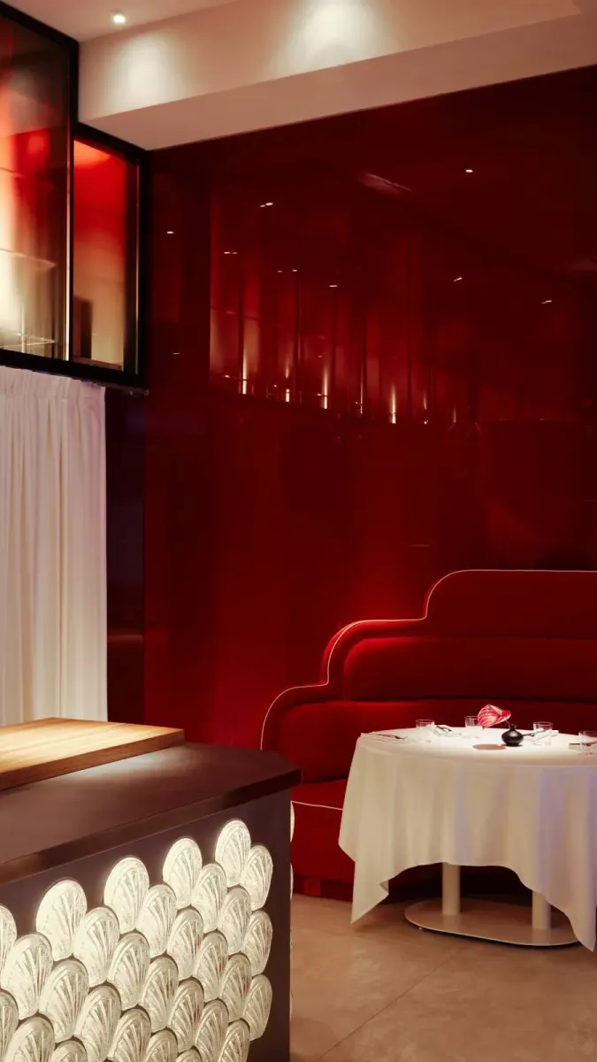 Над интерьером работала студия S+S Ирины и Ольги Сундуковых. Вместо ожидаемого красного лака — закалённое стекло, которое смотрится эффектно и свежо. В основе три цвета: насыщенный красный как символ удачи, глубокий чёрный и тёплый белый. Открытая кухня выполнена в хромированном металле с акцентной стойкой из стеклянных блоков фальконье, а геометрия лакированного бара отсылает к силуэтам пагод. На стенах — антикварные рисунки XIX века на рисовой бумаге, фотографии с гонконгских барахолок и работы современных художников. Винтажные комоды и колонны гармонично сочетаются с современными элементами — всё продумано до деталей, вплоть до сервировки.