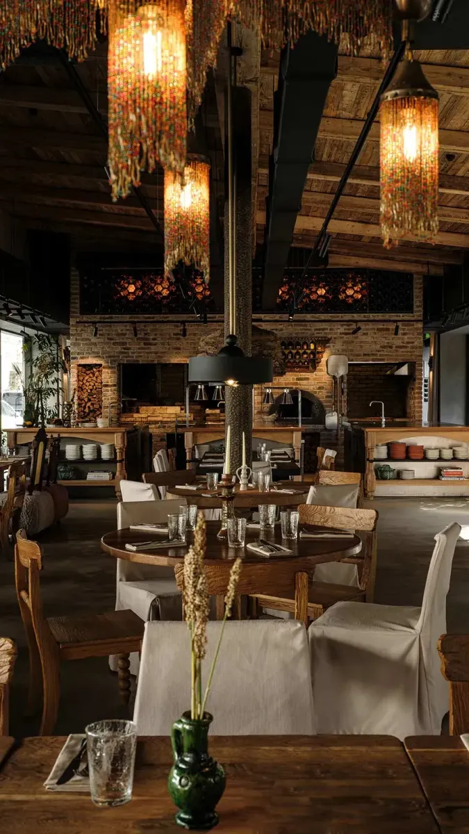 Пространство оформила Наталья Белоногова из бюро NB-Studio. Дизайнер отталкивалась от образа старых сараев — грубоватое дерево, состаренные поверхности, шкуры на скамьях, полки с разнородными находками. Светильники, сплетённые вручную из лозы, и стеклянные блоки фальконье смягчают брутальность фактур. Ресторанного лоска здесь чуть меньше, чем ожидаешь от Lucky Group, но именно это создаёт обволакивающее ощущение — как будто ужинаешь не в ресторане, а в загородном доме, где серьёзно относятся к еде. В зале 94 места.