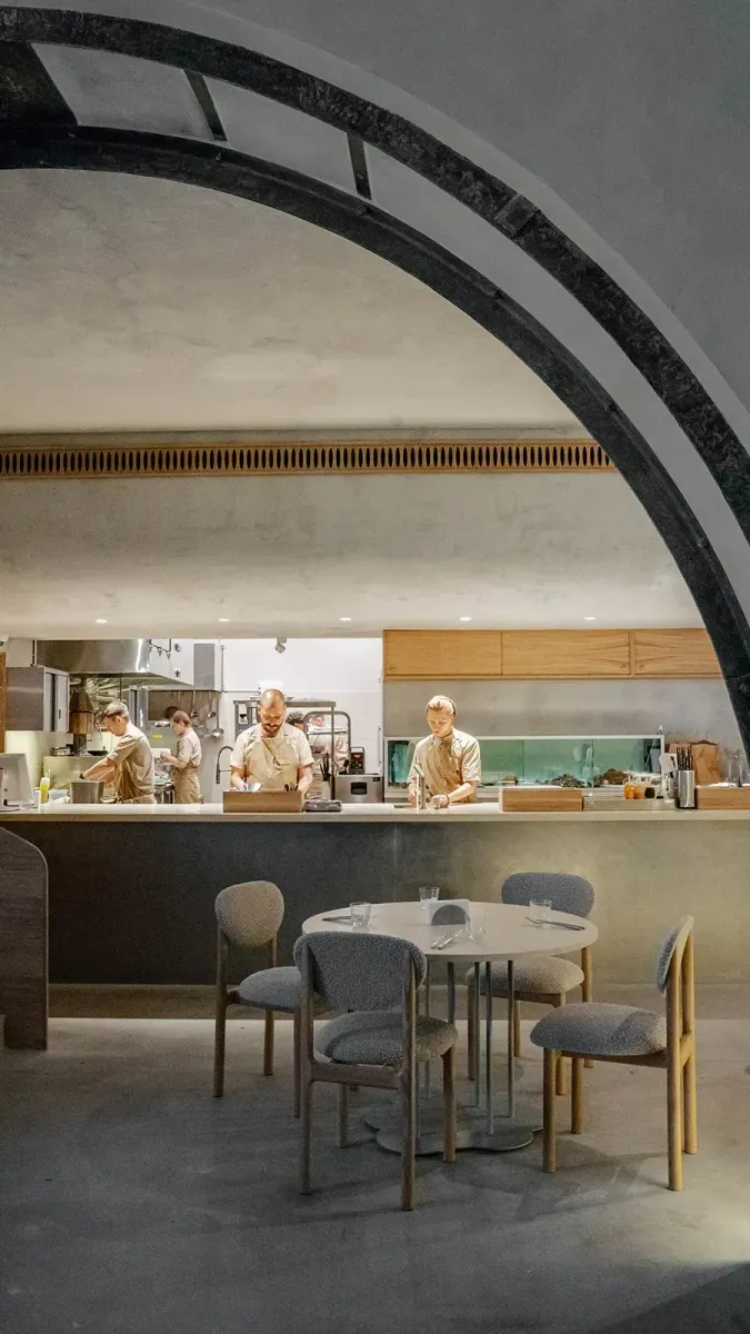 Soma расположилась в старинном особняке на Петровском бульваре — том самом, где в дореволюционные времена отмечали дни рождения Тургенева и Достоевского, праздновали свадьбу Чайковского. Сегодня историческим стенам досталась новая роль: архитектор Гоша Айгунян разделил пространство на три зала с характерами разных эпох. «Зал прошлого» сохранил колонны, кирпичную кладку и своды монье. «Зал будущего» — его полная противоположность: арка-портал, левитирующая световая лента и зеркало-сфера. Между ними — «зал настоящего» с открытой кухней, где можно наблюдать за работой поваров.