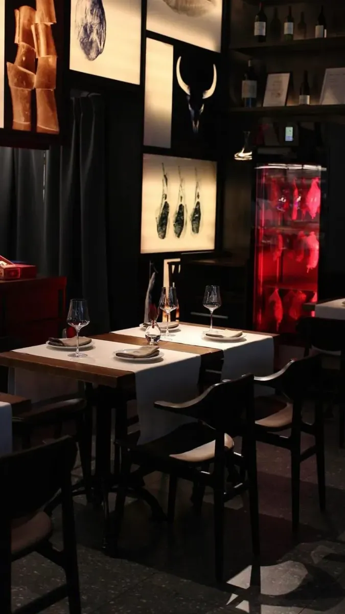 В интерьере преобладают тёмные оттенки: серые фактурные стены с картинами, тёмные деревянные столы с белыми скатертями. Атмосферу создают камера сыровяла, видная из любой точки, и открытая кухня.