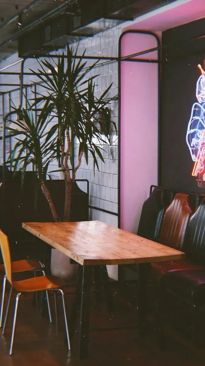 Есть, кстати, и веганские позиции: Бургер Фалафель и Веганбургер. Внутри — камерное пространство с высокими деревянными столами, панорамными окнами и гирляндами на потолке. Атмосферное место, где можно встретиться с друзьями и приятно провести время.