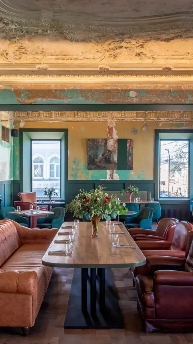 Винная карта ресторана от шеф-сомелье Виктории Маркевич балансирует между классикой и авангардом, а в барной карте от Александра Горбунова вкусы лесных трав и шишек соединяются с мировыми трендами. В интерьере преобладают зеленые оттенки, много воздуха, света и лепнина на потолках.