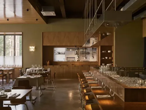 Ресторан открылся на «Ленфильме» в прошлом августе и успел попасть в мою подборку эстетичных интерьеров 2023. В дизайне — восстановленный модернизм на месте ресторана кинематографистов «Аквариум», работавшего здесь в 70-х. Вживую так же зрелищно, как и на фото, если бы не красные розы на столах — удручающее сочетание. В концепте — современная ближневосточная кухня от Марка Шах Акбари, шефа с иранскими корнями. Можно попробовать кебабы, мезе и сочетания вроде лосося с финиками. Я был в Cast во вторник и оказался единственным гостем.