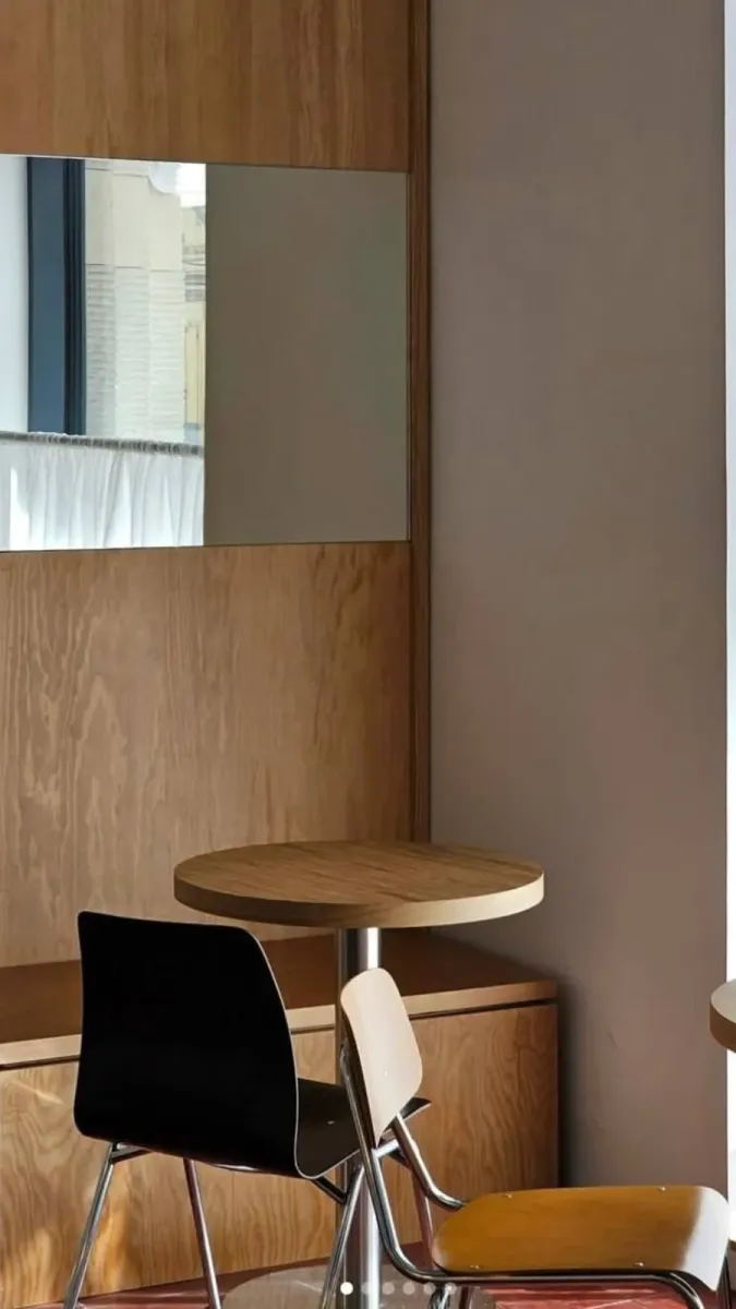 Интерьер кафе выполнен в духе современной минималистичной эстетики с элементами скандинавского и индустриального стиля. Основу оформления составляют светлое дерево и нейтральные серо-бежевые тона стен. Потолок оставлен открытым, с видимыми коммуникациями и вентиляционными трубами, что добавляет индустриального характера. Пол выложен тёмно-красной плиткой, создающей контраст с мебелью и стенами. Мебель — простая и функциональная: круглые деревянные столы, стулья с фанерными сиденьями и металлическими ножками. В некоторых зонах использованы мягкие пуфы и встроенные деревянные лавки. На стенах — минималистичные зеркала и плитка белого цвета с бордовым акцентом. Барная зона с витриной оформлена в том же стиле: деревянный фасад, строгие линии и минимум декора.