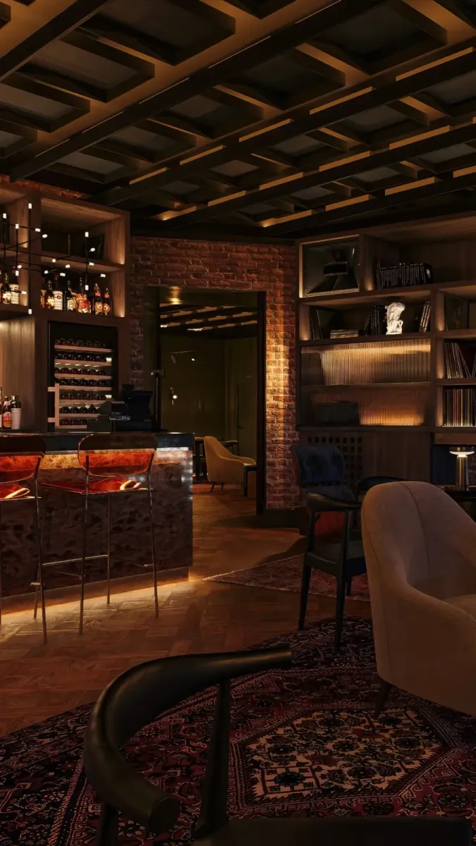 Интерьер разработан лондонским бюро Studio Cache. Пространство выдержано в спокойных тонах с акцентом на комфорт и визуальную лаконичность. В центре — барная стойка и премиальная акустическая система Tannoy, задающая ритм всему залу. Мягкий свет, мебель с приглушённой текстурой и натуральные материалы делают зал камерным и тёплым. В оформлении чувствуется британская сдержанность, при этом каждая деталь подчёркивает музыкальную направленность проекта.