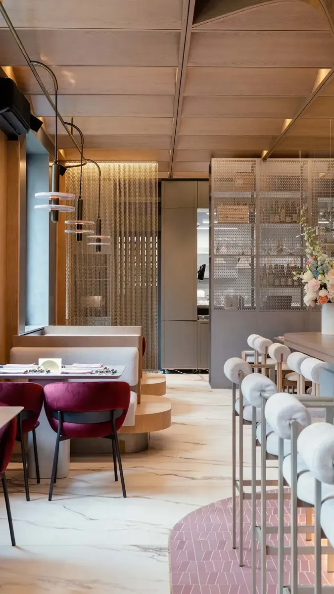 В интерьере — идеи итальянского футуризма: кубическая конструкция потолка, контрасты, панорамные окна, наполняющие пространство светом. Холодный бетон перекликается с теплым деревом, потолок плавно перетекает в бар. Атмосферу дополняют детали, например, на тарелках, созданных специально для проекта, можно заметить орнамент, повторяющий узор решеток Михайловского сада и росписи Джакомо Кваренги со стен Эрмитажа.