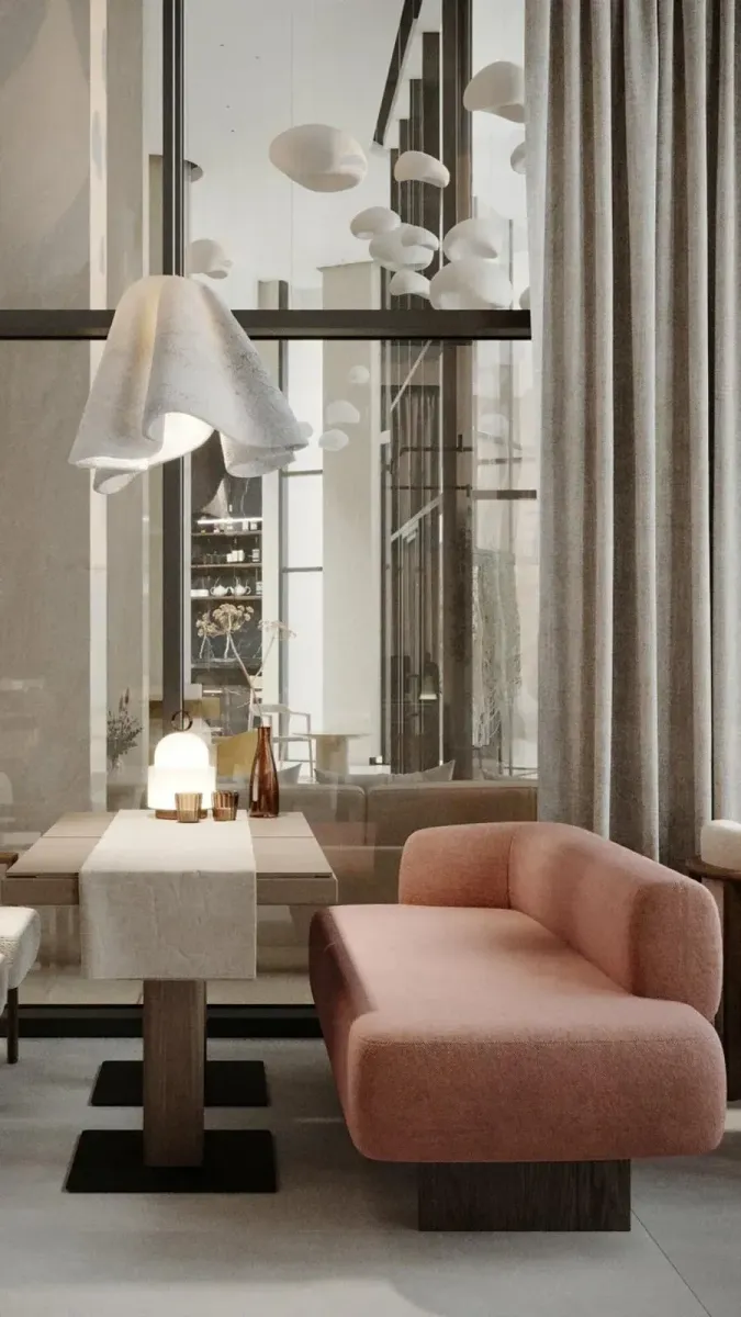 За визуализацию пространства отвечало бюро SUITE N.7. Внутри просторно: большое помещение с высокими потолками, наполненное светом, благодаря большим панорамным окнам. Вокруг можно заметить колонны, декорированные высокими деревянными панелями, а по всему пространству расставлены живые деревья. Светлые мягкие кресла, привезенные прямо из Америки, венские стулья, удобные столы с вращающейся серединой.