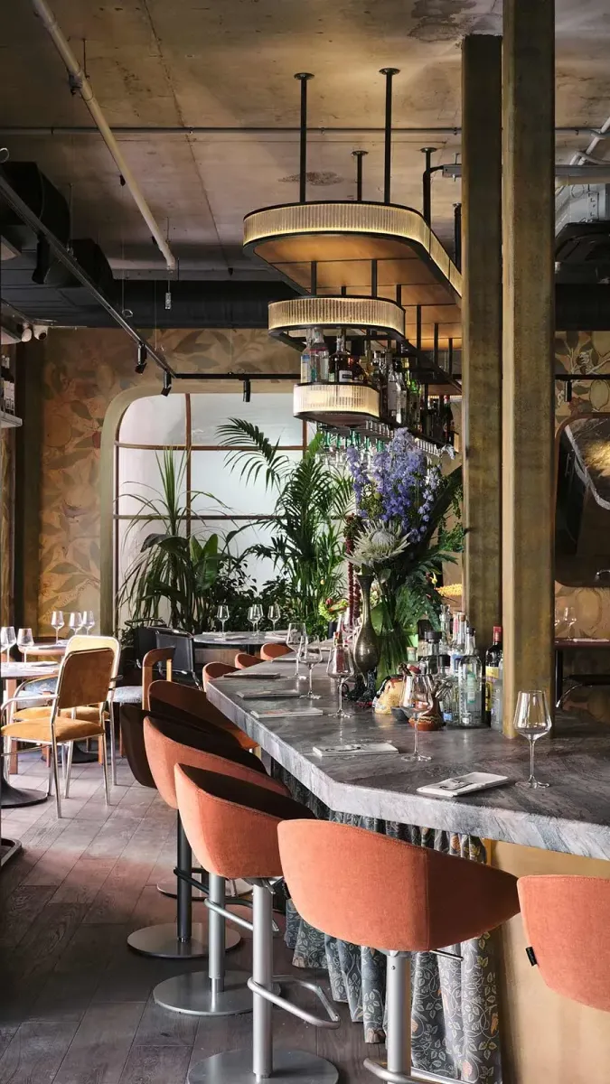 Дизайн пространства доверили петербурженке Евгении Ужеговой. Пятиугольная контактная барная стойка освещается факелами, отблески от которых падают на витражи, изразцовую плитку и зеленые ложи. Летом на террасе горит живой огонь, что делает это место ещё притягательнее.