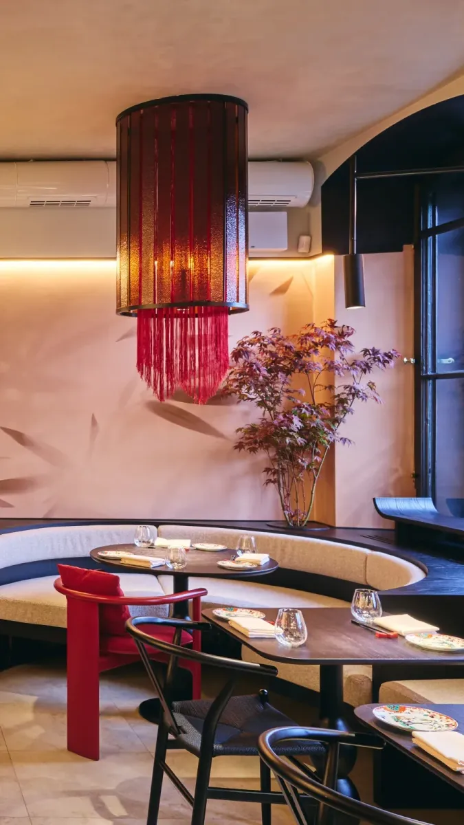 Интерьер разработан студией UpToYou Design. Дизайн выполнен в современном азиатском стиле с элементами шинуазри и настроением колониального Шанхая. Пространство разделено на два зала широкой барной стойкой из черного мрамора, над которой расцветает огромный лотос. Внутри — сочетание черного, красного и золотого, резная мебель, ткани с орнаментами, свет, напоминающий закат в Поднебесной. Каждый элемент продуман: обои с листвой, камни с иероглифами «икигай», формы, привезенные из Таиланда и текстуры, отсылающие к разным культурам Азии.