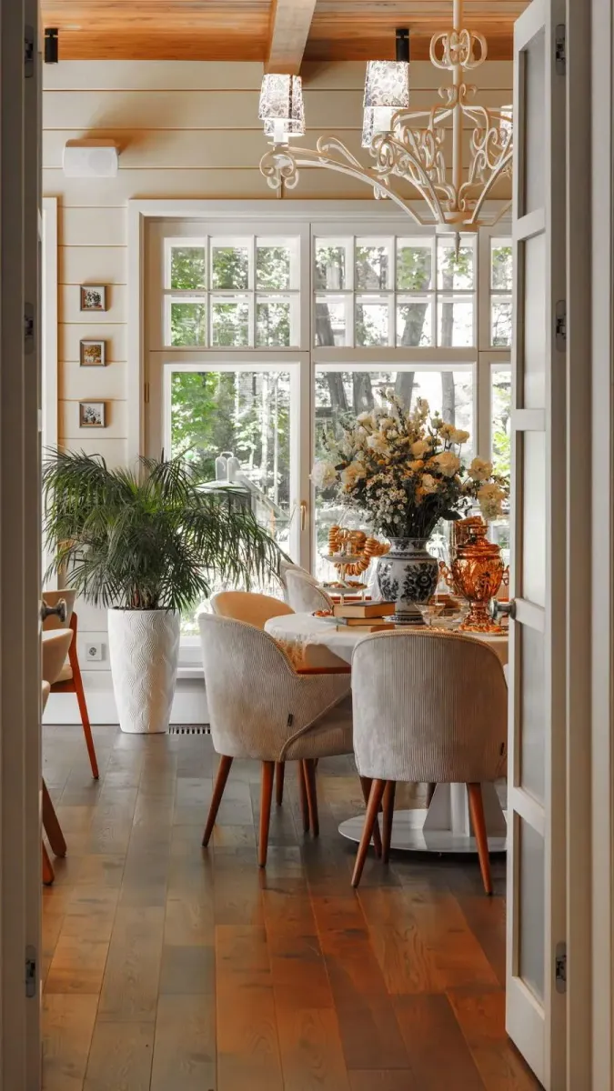 Интерьер ресторана напоминает старинную усадьбу, где каждая деталь подчеркивает ощущение уюта и истории. Пространство оформлено в светлых тонах с акцентом на природные материалы — дерево, лен, керамику. Высокие потолки, большие окна и мягкий рассеянный свет создают ощущение простора, а элементы исторической отделки сохраняют характер дома начала XX века. Внутри — лаконичная мебель, текстиль в приглушённых оттенках и зелёные растения формируют спокойное, загородное настроение.