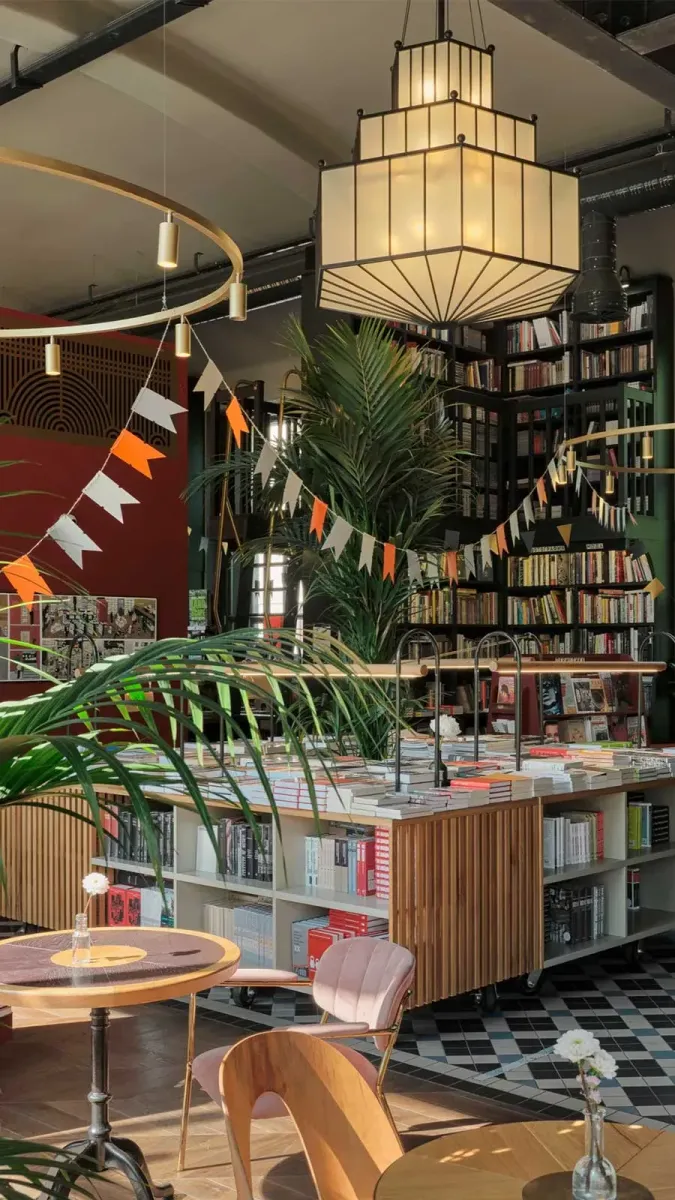 Можно сесть за столиком у панорамного окна или затеряться среди книг — огромная площадь магазина позволяет.