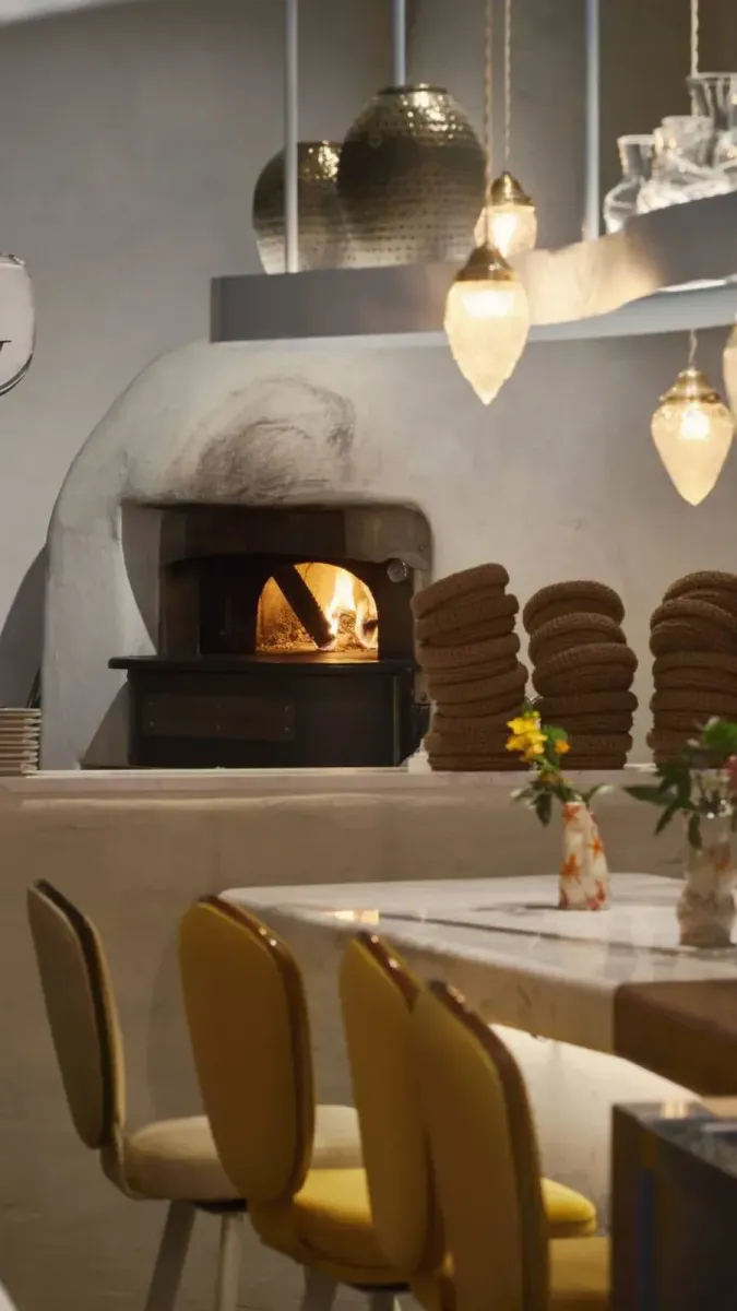 Внутри — стены украшены светлой плиткой с яркими декоративными вставками, элегантные круглые столы, покрытые белоснежными скатертями, и разноцветные стулья. Центральный зал оформлен в теплых тонах, с акцентом на натуральное дерево и мягкое освещение. Современные стеклянные люстры добавляют изысканности, а открытая кухня позволяет гостям насладиться процессом приготовления блюд. Особое внимание привлекает зона с дровяной печью, выполненной в рустикальном стиле. Грубая каменная отделка и минималистичный дизайн создают ощущение традиционности и аутентичности.