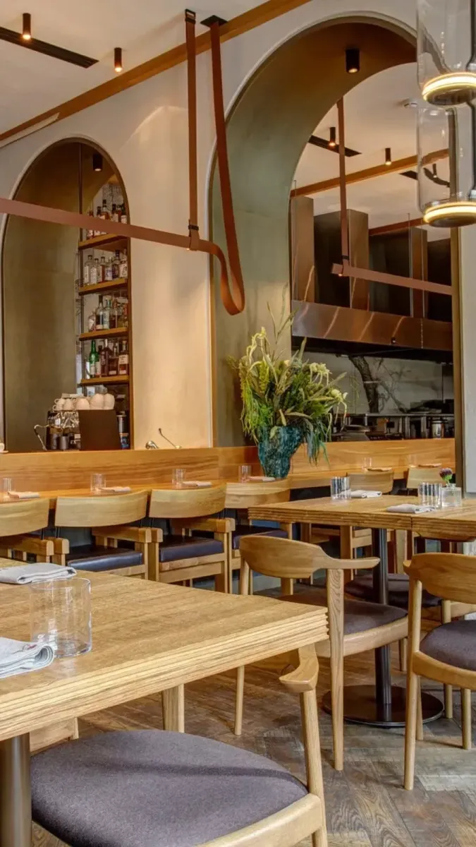 Интерьер ресторана выполнен в современном минималистичном стиле с акцентом на натуральные материалы и теплые оттенки. Внутри — массивные деревянные столы и элегантные стулья с мягкой обивкой. Цветовая гамма интерьера выдержана в нейтральных и природных тонах — светло-коричневые, серые и зеленые оттенки с яркими акцентами в деталях. Стены разрисованы яркими синими элементами, придающими пространству художественность. По залам расставлены горшки с живыми растениями. В центре — функциональная барная стойка с аккуратно размещенными полками для напитков.