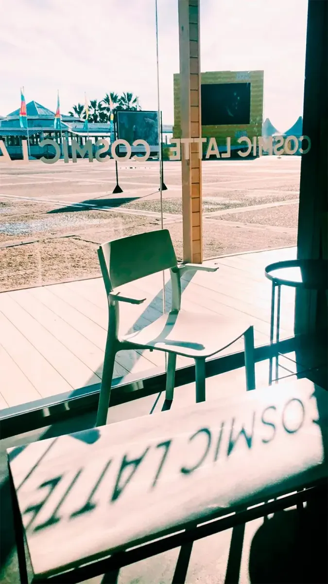 В интерьере — холодные «космические» оттенки, на стенах — фотографии космических экспедиций, повсюду используются «звёздные паттерны». Вместо классического объема напитков — планеты: от маленькой Земли до Большого Сатурна. Внутри — светлое пространство, а снаружи — очень приятная и атмосферная веранда, где можно наслаждаться свежим морским воздухом и видами на пальмы и море. Кофейня dog-friendly, здесь часто можно встретить людей с питомцами, которых всегда рады видеть.