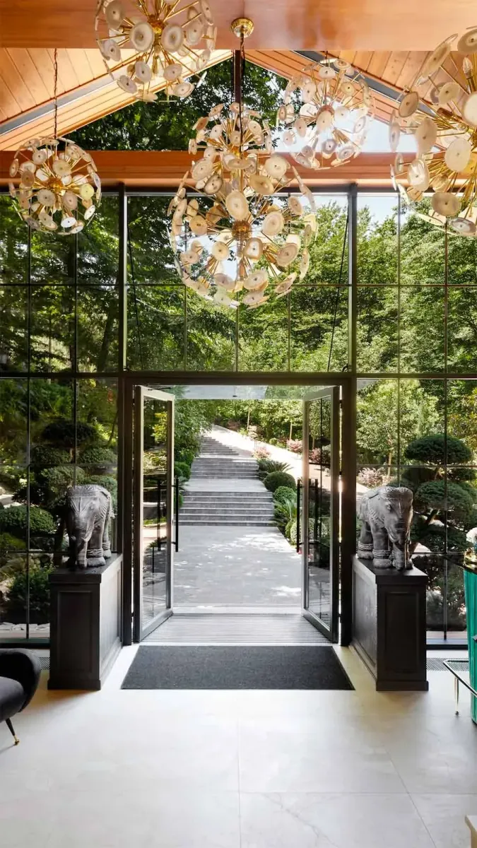 Из больших панорамных окон открываются виды на сад, в которым высажено около трех тысяч разных растений, привезенных из тосканского питомника. Вечером атмосферу создает камин. Ресторан окружен террасами и беседками, у каждой из которых индивидуальный дизайн. В теплое время года можно расположиться на улице, слушать звуки природы и журчание ручья, который протекает сквозь сад. Внутри — элегантный интерьер, с натуральными материалами в отделке, большими креслами. белыми скатертями и приглушенным освещением. На территории можно обнаружить вернисаж под открытым небом, по вечерам здесь работает уличный кинотеатр, а по воскресеньям — музыкальное сопровождение от Струнного квартета им. С.В. Рахманинова.