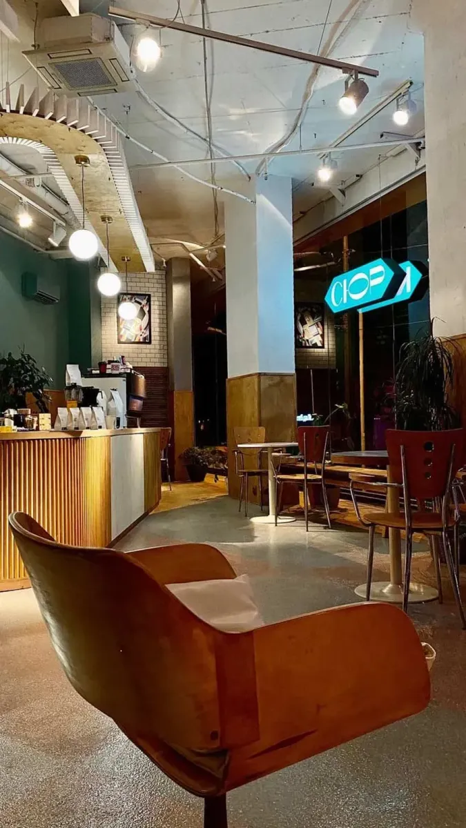 Внутри — приятный и яркий интерьер: высокие потолки, панорамные окна, живые растения. На стенах — деревянные панели и абстрактные картины. Светлая деревянная мебель, точечное освещение, колонны, много свободного пространства и комфортные посадочные места. В интерьере можно заметить разные элементы декора: от диско-шара на потолке до серебристого дождика над барной стойкой и старого телефона. Здесь же виниловая аудиосистема и пластинки.