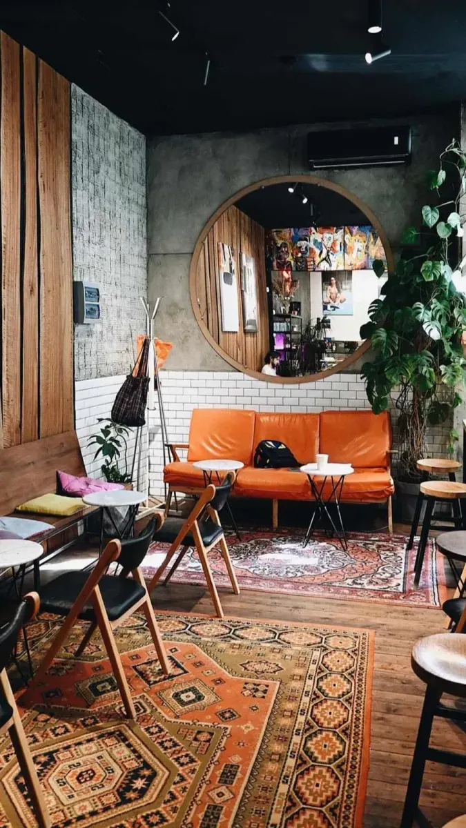 В интерьере от фабрики Surf Hommie — узнаваемая стилистика сети: на стенах — деревянные доски и фотографии, рисунки и картины, большое круглое зеркало. Дополняют пространство живые растения и узорчатые ковры на полу. Место комфортное как для работы, так и для отдыха и встреч. Расположиться можно у небольших столиков на диване или на деревянных скамейках. У Surf Coffee × Navaginskaya есть собственный тенистый дворик, где можно спрятаться от солнца в жаркие дни. У входа — разрисованные деревянные трибуны.