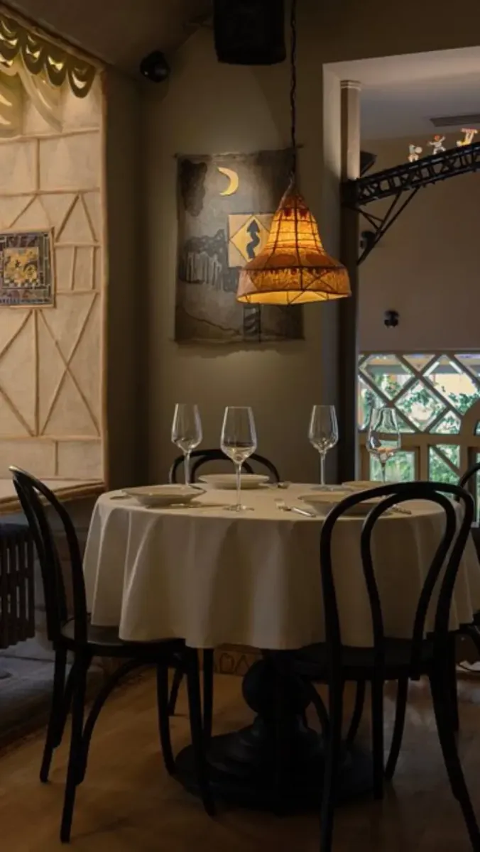 Интерьер выполнен в современном дизайне с элементами винтажного стиля. Благодаря большим окнам, пространство наполнено теплом и естественным светом. Внутри — стены украшены декоративной плиткой с геометрическими узорами и художественными вставками. Вдоль — ряды деревянных столов, накрытые белоснежными скатертями, и стульев с элегантными гнутыми спинками. В центре — барная стойка, выполненная из натурального дерева и ажурные абажуры из металла, свисающие с потолка.